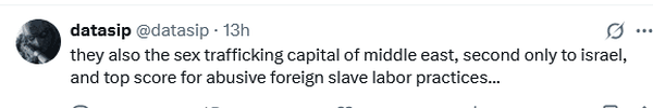 اونها همچنین پایتخت قاچاق جنسی خاورمیانه هستند (بعد از اسرائیل در رتبه دوم قرار دارند) و در بدرفتاری با کارگران خارجی و بردهداری مدرن هم در رتبهی بالایی هستند.