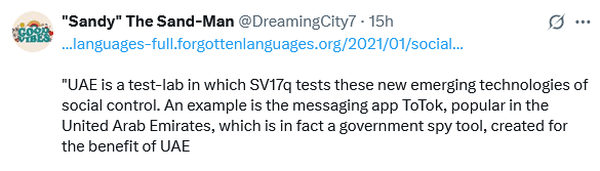 امارات متحده عربی یک آزمایشگاهی است که در آن SV17q فناوریهای نوظهور کنترل اجتماعی را آزمایش میکند. نمونهای از این موضوع، اپلیکیشن پیامرسان ToTok است که در امارات بسیار محبوب است، اما در واقع یک ابزار جاسوسی دولتی است که برای منافع امارات ساخته شده است.