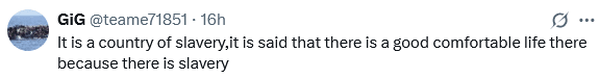 این کشور بردهداری است، گفته میشود که زندگی راحت و خوبی در آنجا وجود دارد چرا که بردهداری وجود دارد.