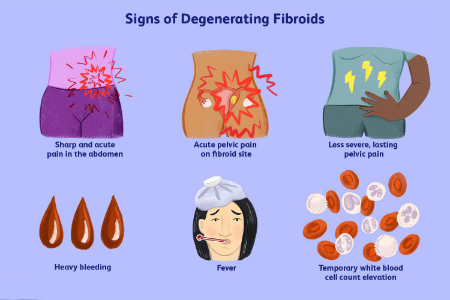 تجزیه (دژنراسیون) شکستن داخلی فیبروم به دلیل کمبود خون است که انواع هیالین، کیستیک یا قرمز دارد. ترکیدن پارگی خارجی و نشت به حفره شکمی است که اورژانسیتر است.