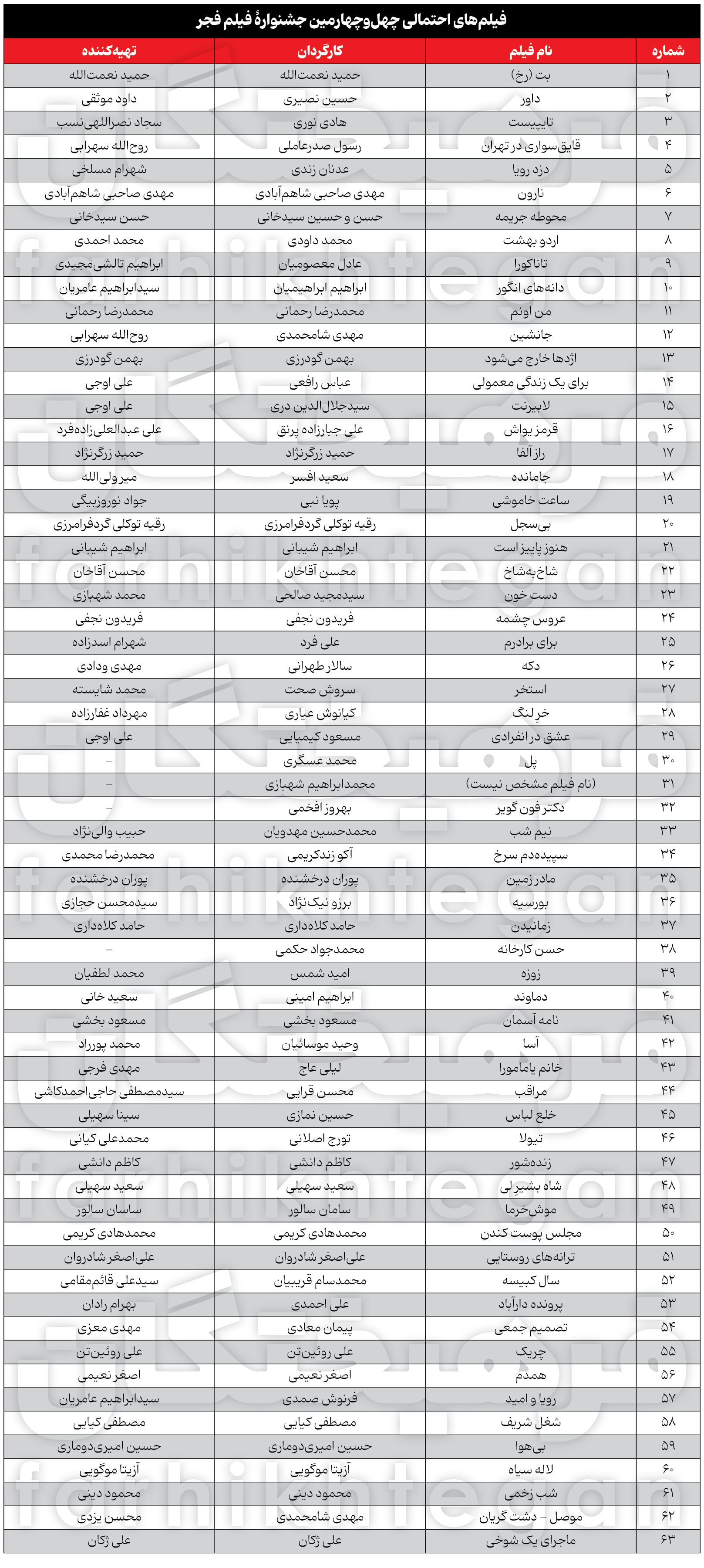 به گزارش مشرق، سه ماه تا آغاز چهلوچهارمین جشنواره فیلم فجر باقی مانده است؛ رویدادی که هر سال نهتنها ویترین اصلی سینمای ایران به شمار میرود، بلکه نبض جریانهای تازه فیلمسازی را نیز در دست دارد. امسال نیز همچون سالهای گذشته، به سراغ بررسی فیلمهای احتمالی این دوره رفتهایم. بر اساس اطلاعات حدود ۶۳ فیلم در حال ساخت امکان حضور در جشنواره فیلم فجر را دارند و باید دید با نظر هیئت انتخاب، کدام آثار به این جشنواره راه پیدا میکنند.