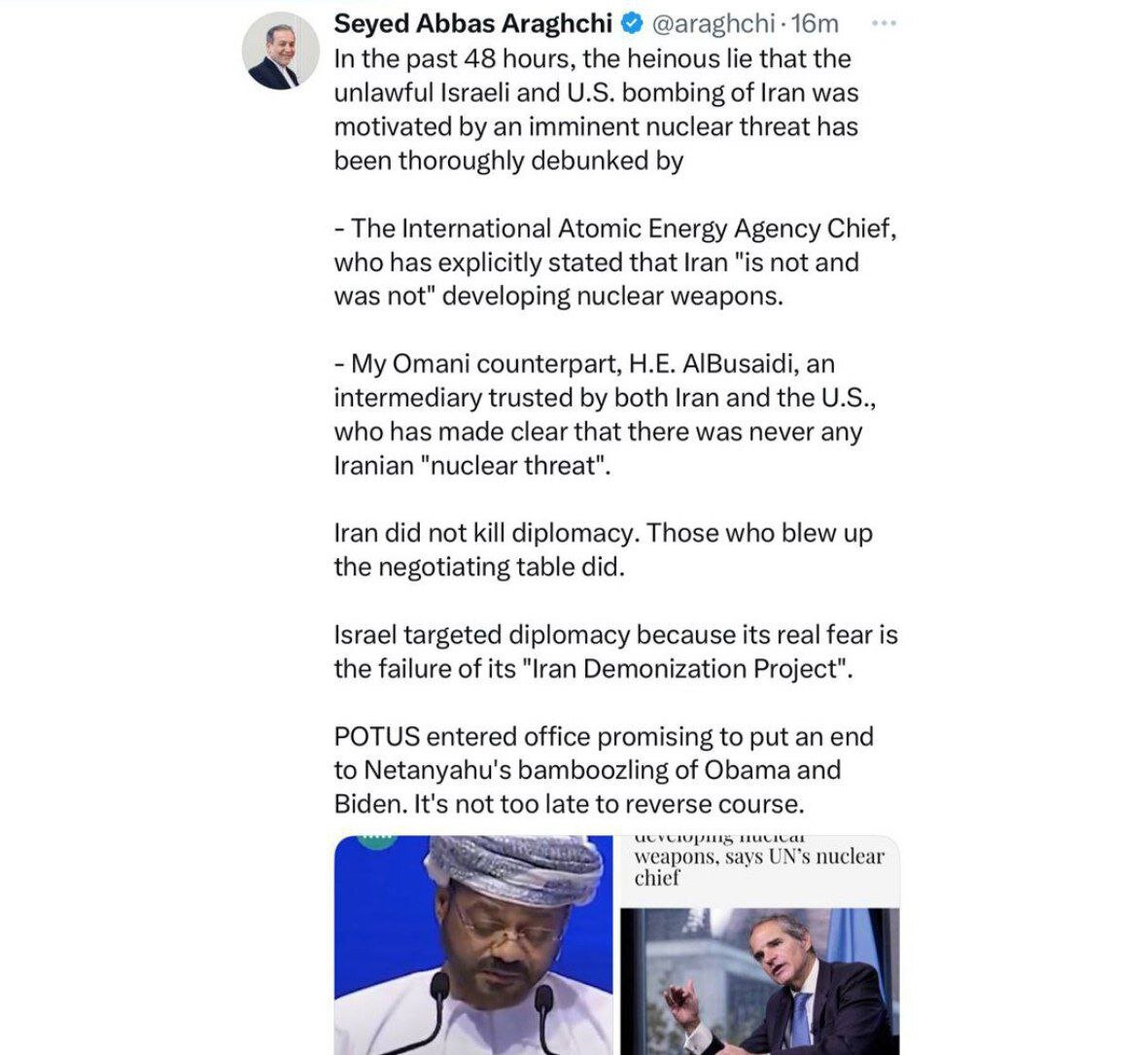 به گزارش خبرگزاری مهر، سید عباس عراقچی، وزیر امور خارجه ایران در پیامی در شبکه اجتماعی خود نوشت: در ۴۸ ساعت گذشته، دروغ شنیعی که بمباران غیرقانونی ایران توسط رژیم اسرائیل و ایالات متحده را با «تهدید هسته‌ای قریب‌الوقوع» توجیه می‌کرد، به‌طور کامل افشا شد.