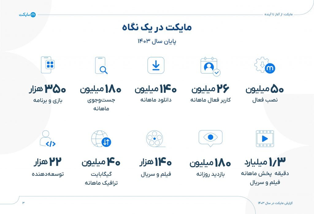 همچنین کاربران مایکت در سال ۱۴۰۳ مجموعاً ۱.۵ میلیارد مرتبه بازی و برنامه دانلود کردهاند. رکورد نصب روزانه نیز در اولین روز سال یعنی یک فرودینماه با ۸.۶ میلیون نصب، رقم خورده است.