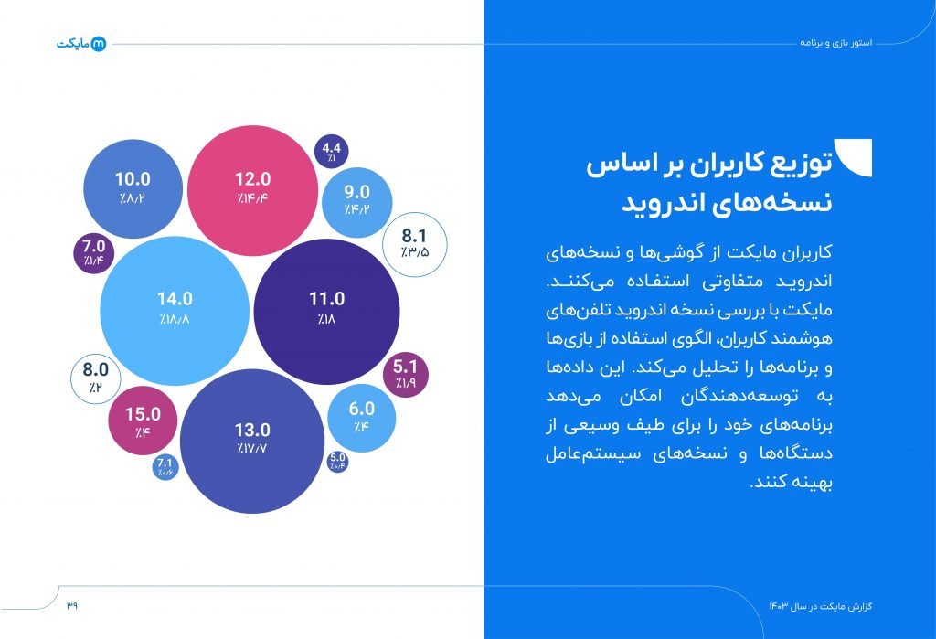 گزارش سالانه مایکت نشان میدهد اندروید ۱۴ با سهم ۱۸.۸ درصدی تا پایان سال گذشته محبوبترین نسخه در میان کاربران بوده است. بعد از آن نیز نسخههای ۱۱، ۱۳ و ۱۲ قرار گرفتهاند.