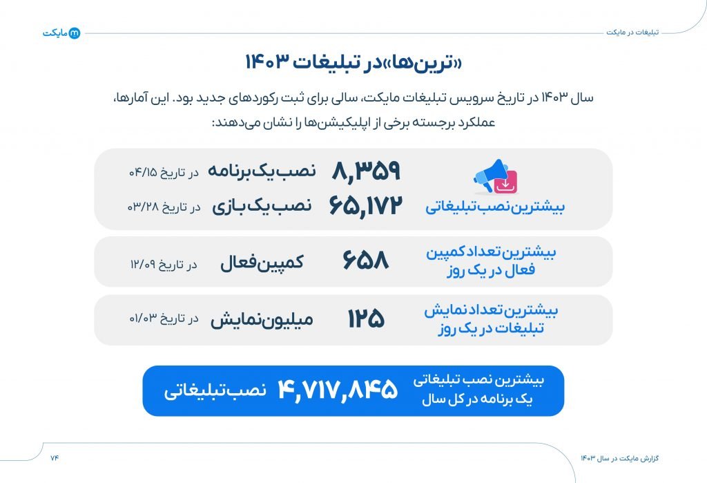 رکوردهای نصب تبلیغاتی نیز حاوی آمار و ارقام جالب توجهی است. بیشترین نصب تبلیغاتی موفق به برنامهای است که در سال ۱۴۰۳ حدود ۴ میلیون و ۷۱۷ هزار نصب از این طریق ثبت کرده است.