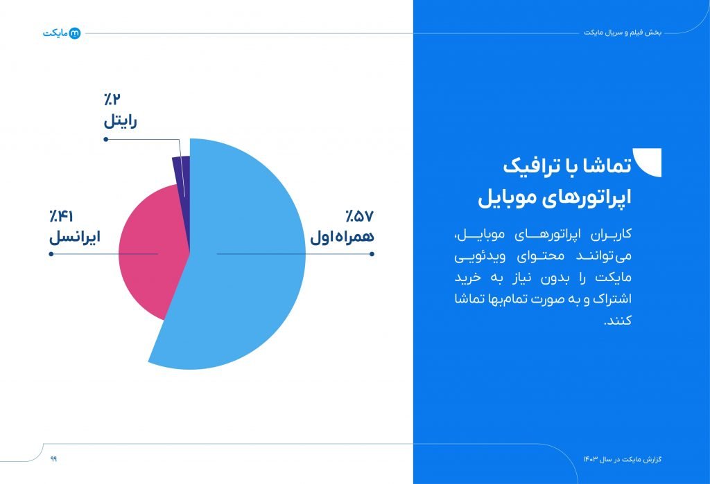 در بخش فیلم و سریال، به صورت میانگین ۲ میلیارد دقیقه پخش ماهانه گزارش شده است. همچنین کاربران مایکت مجموعا ۹۲ هزار سال به تماشای مسابقات لیگ برتر فوتبال ایران از طریق مایکت نشستهاند.