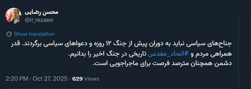جناحهای سیاسی نباید به دوران پیش از جنگ ۱۲ روزه و دعواهای سیاسی برگردند. قدر همراهی مردم و اتحاد مقدس تاریخی در جنگ اخیر را بدانیم.