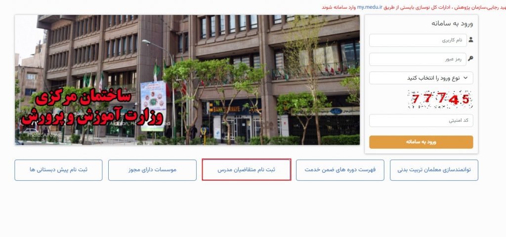 ابتدا وارد سامانه ضمن خدمت فرهنگیان شوید و در همان صفحه اصلی گزینه ثبت نام متقضیان مدرس را انتخاب کنید.