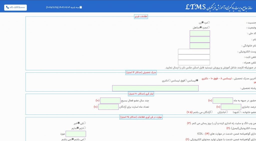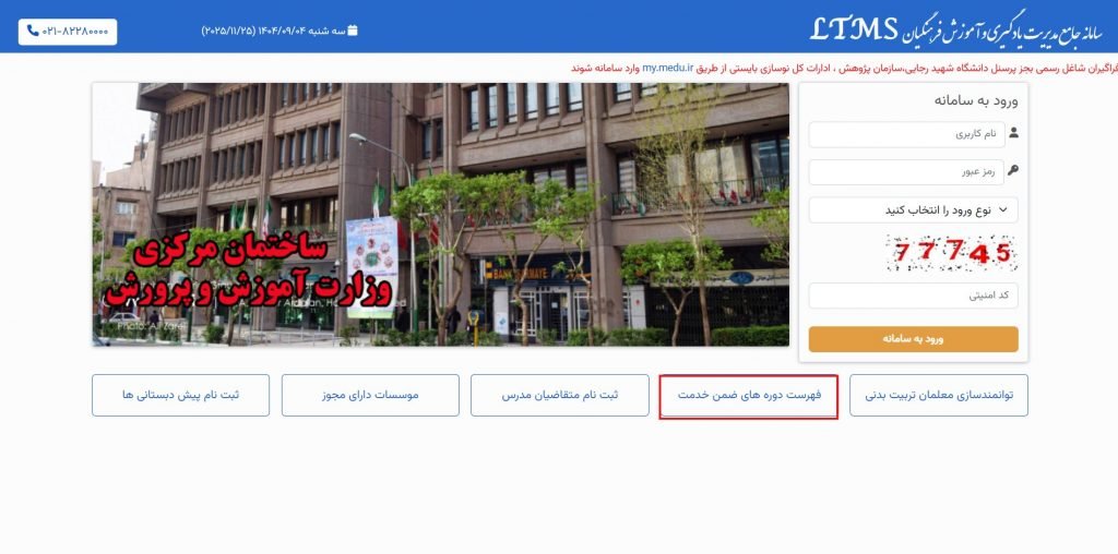 سامانه ضمن خدمت فرهنگیان که با نام LTMS شناخته میشود، مخفف عبارت Learning & Training Management System است و بهعنوان سامانه رسمی آموزش و پرورش برای مدیریت دورههای آموزشی و ارتقای مهارت فرهنگیان طراحی شده است. این سامانه با هدف ساماندهی یکپارچه دورههای آموزش ضمن خدمت، کاهش فرآیندهای اداری سنتی و ثبت دقیق سوابق آموزشی ایجاد شده است.
