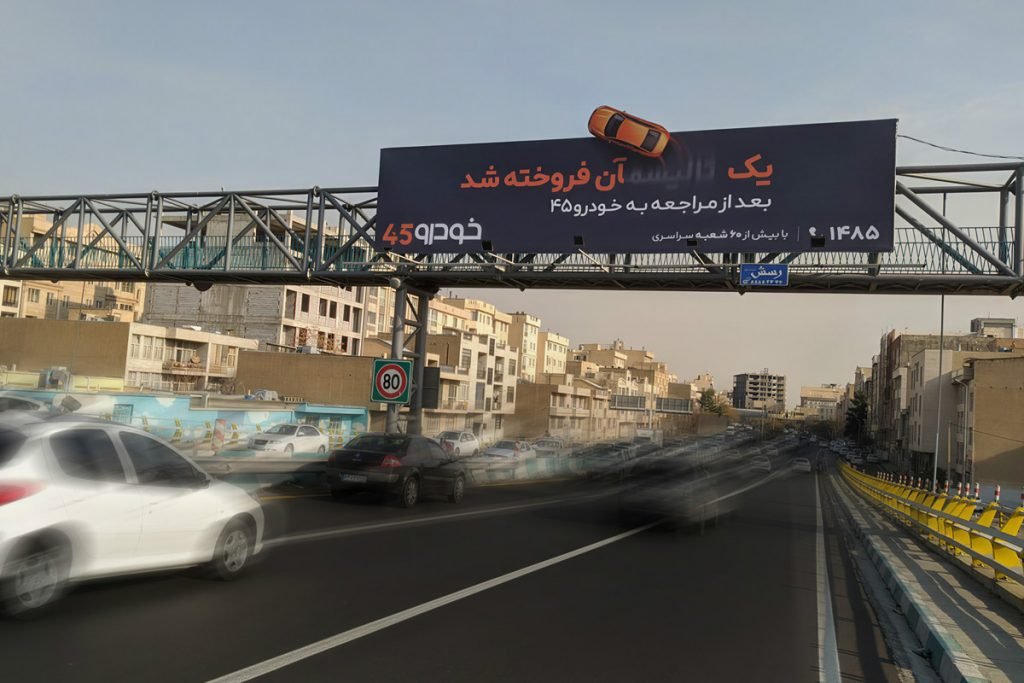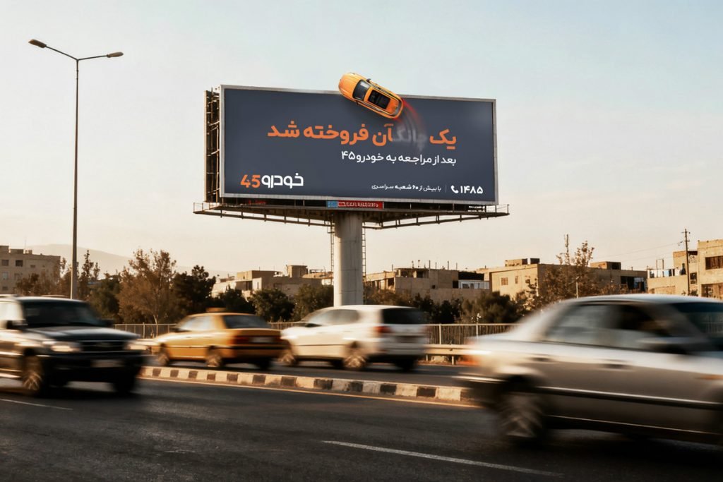 کمپین تبلیغات محیطی خودرو۴۵ از ۲۵ آذرماه به مدت یک ماه در شهر تهران اکران شده است. این کمپین با رویکردی نتیجهمحور و پیام کلیدی «یک… آن فروخته شد»، بر سرعت عملیاتی این پلتفرم بهعنوان راهکاری برای فروش خودرو با یکبار مراجعه تأکید میکند.