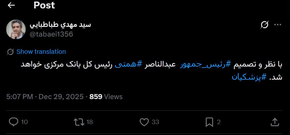 او در ادامه نیز با انتشار پستی در شبکه اجتماعی ایکس نوشت: «با نظر و تصمیم رئیس جمهور، عبدالناصر همتی رئیس کل بانک مرکزی خواهد شد.»