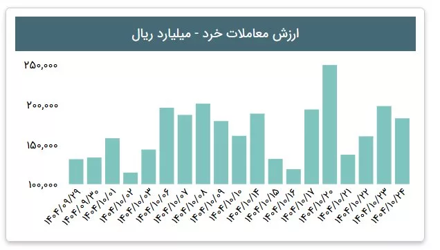 ارزش معاملات خرد امروز بیش از ۱۰ هزار میلیارد تومان بوده که کمتر از میانگین ماهانه، یعنی 16 هزار و 636 میلیارد تومان است.