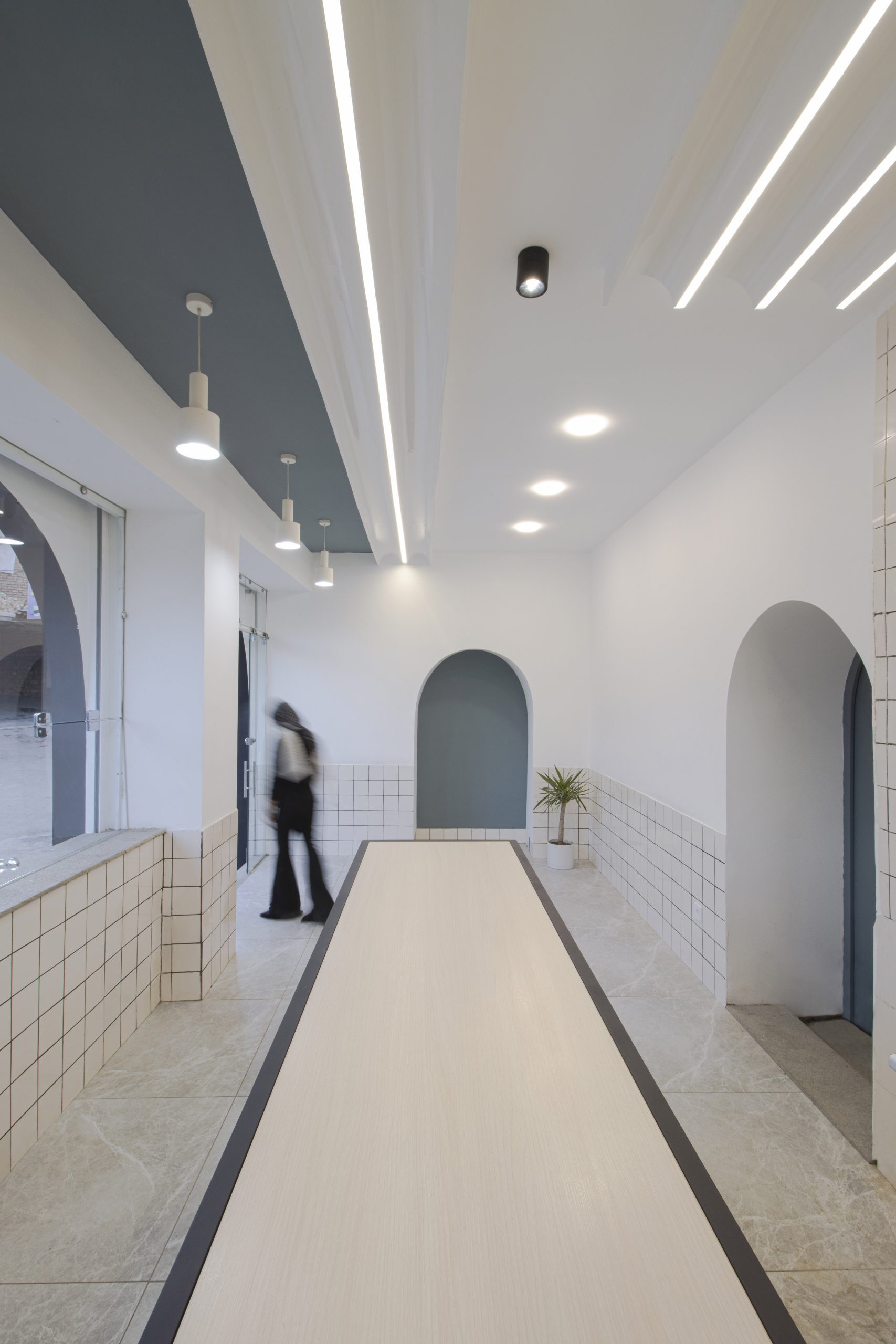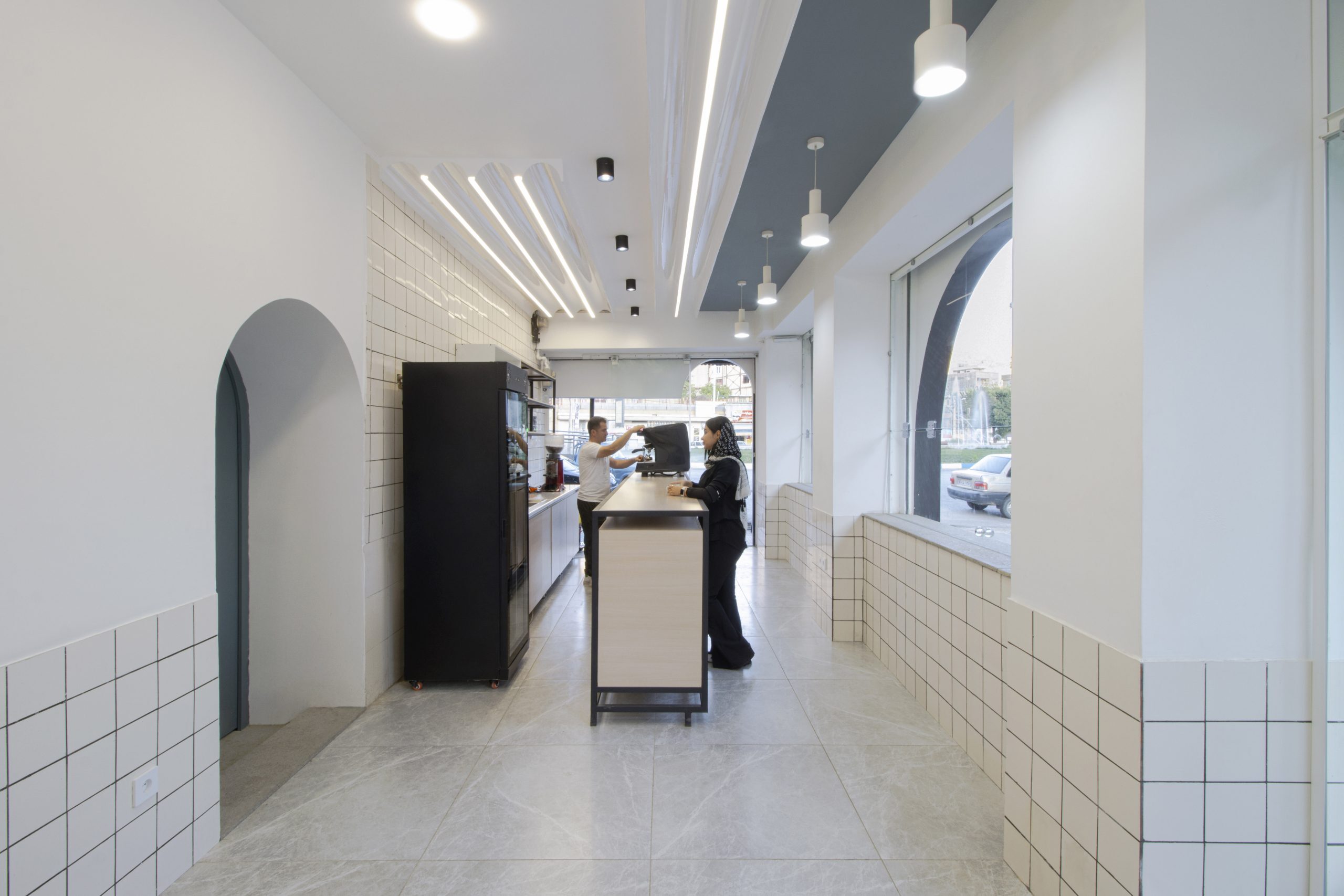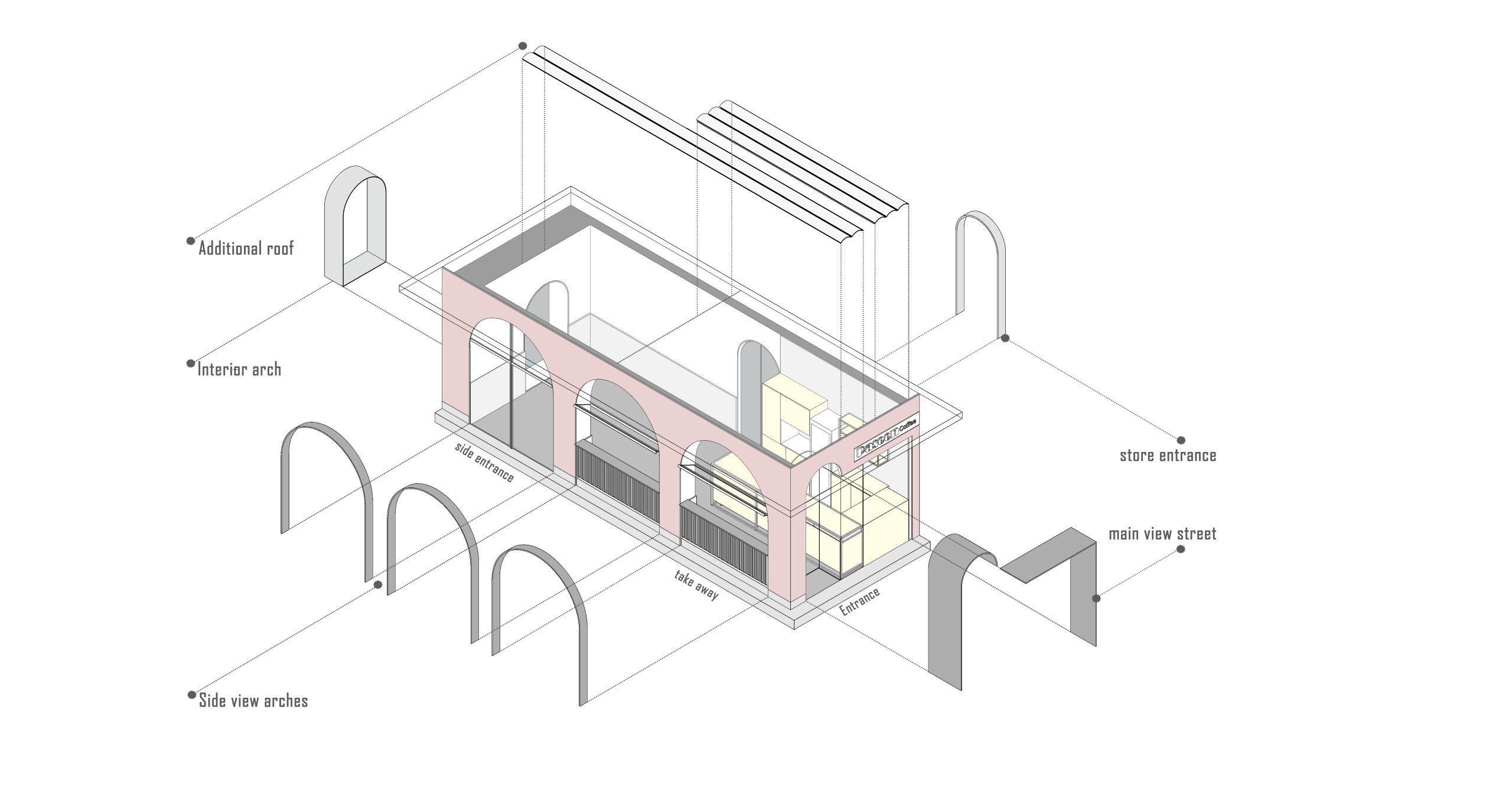 در تحلیل سیرکولاسیون، متراژ و شریان عبوری مغازه به این تتیجه رسیدیم که فضایی مناسبت جهت خدمات میز و صندلی و نشستن را نمی توان فراهم آورد، بدین منظور خدمات کافه را به صورت تیک اوی مد نظر قرار داده اند تا علاوه بر استفاده درست از متراژ مورد استفاده، کاربران کافه به دو جداره درونی و برونی جبهه فرعی تقسیم شوند . در دیاگرام های اولیه ابتدا دو دهانه را به وسیله دیوار با ارتفاع ۱/۱ متر، کور کرده تا علاوه بر کنترل ورودی و خروجی از دو جبهه اصلی نما، فضایی جهت تیک اوی فراهم آورد و ورودی و خروجی مغازه جهت خدمات مناسب تر و سریع تر کنترل شود.