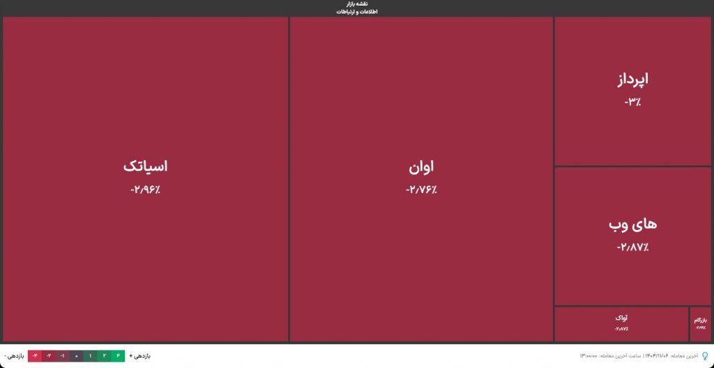 بهگزارش دیجیاتو، ۹۷ درصد از نمادهای بازار امروز منفی معامله شدند، بهطوریکه تنها ۲۴ نماد در محدوده مثبت معامله شدند و در مقابل ۶۴۰ نماد با کاهش قیمت مواجه شدند.