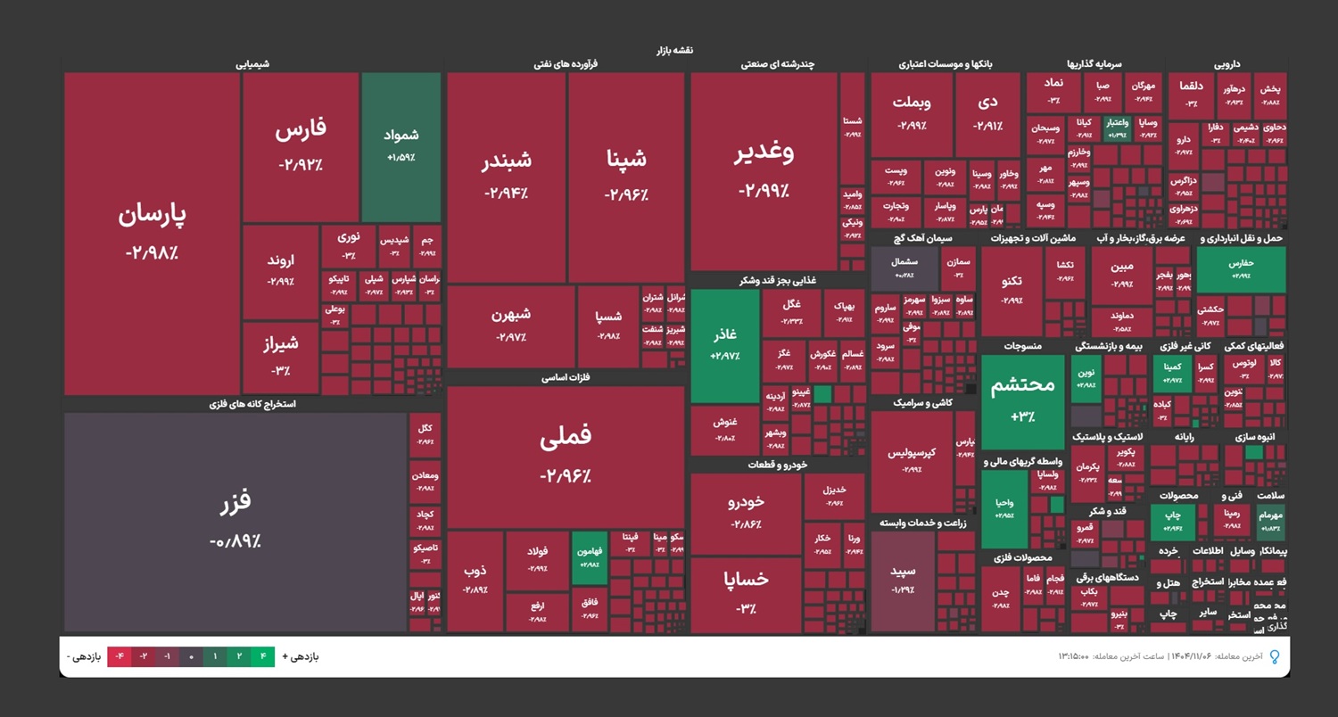 بازار سرمایه در ادامه روند منفی روزهای گذشته، امروز ۶ بهمنماه نیز با فشار فروش شدیدی همراه شد و ۹۷ درصد از نمادهای بورسی در محدوده منفی معامله شدند.