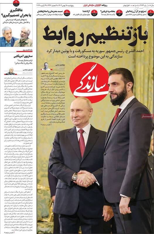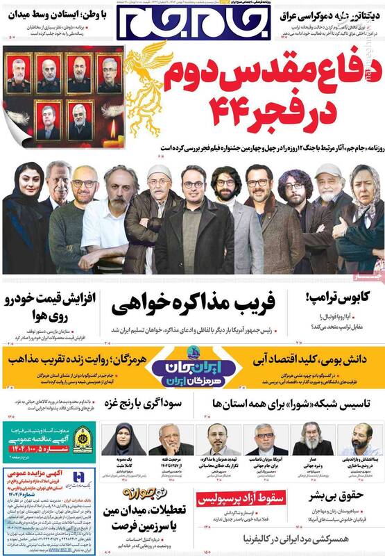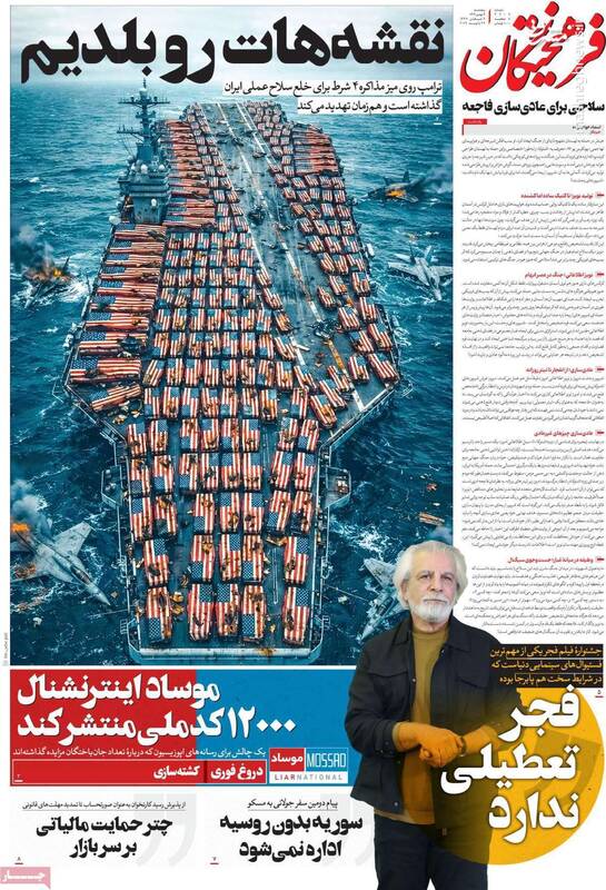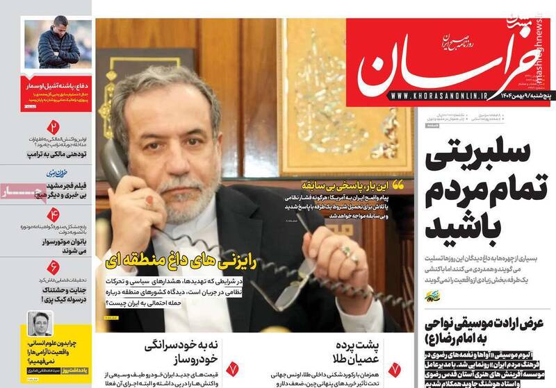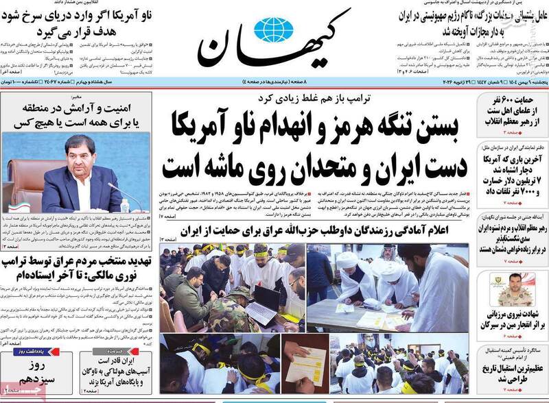 بستن تنگه هرمز و انهدام ناو آمریکا دست ایران و متحدان روی ماشه است، دفاع مقدس دوم در فجر ۴۴، ترامپ در آتش جنگ خواهد سوخت و...از جمله تیترهای روزنامههای پنجشنبه ۹ بهمن هستند.