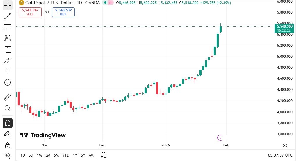 دوشنبه 6 بهمن ماه، طلا برای اولین بار 5000 دلار قیمت خورد و در عرض 4 روز بیش از 10 درصد رشد قیمت را تجربه کرد.