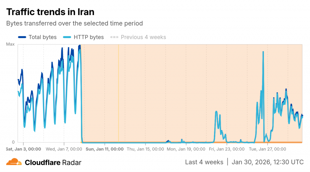 طبق دادههای رادار کلادفلر که وضعیت شبکه را بهصورت لحظهای رصد میکند، پس از سه هفته کامل قطع اینترنت همچنان شاهد رفتار ناپایدار در شبکه هستیم. حجم ترافیک شبکه به حدود ۳۰ درصد قبل رسیده و نوسان زیادی در ارتباط کاربران دیده میشود.