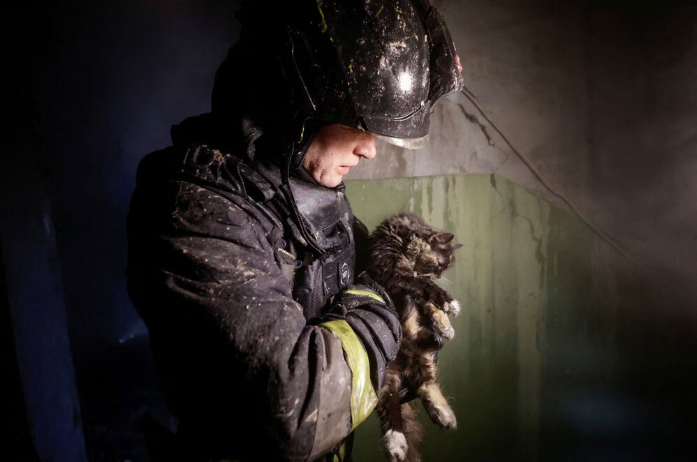 نجات یک گربه از یک ساختمان منفجر شده در اثر حمله در شهر خارکیف اوکراین/ رویترز