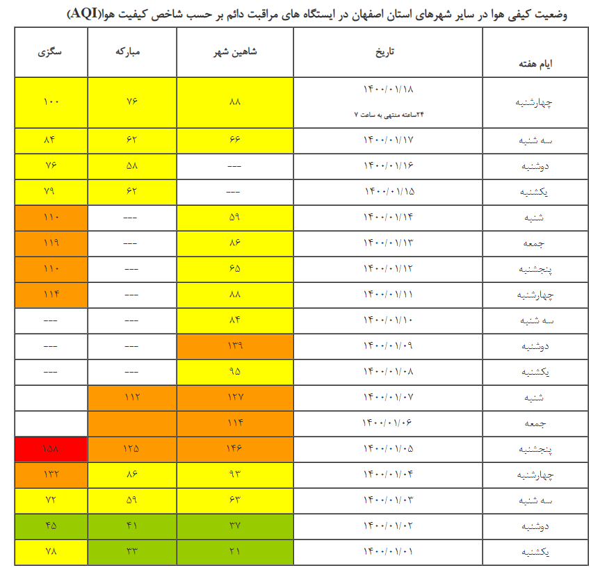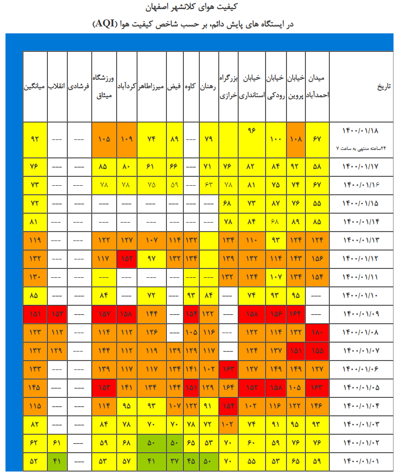براساس اعلام این مرکز میانگین شاخص کیفیت هوا در اصفهان با ثبت عدد ۹۲ بر مدار زرد و سالم است و وضعیت در ایستگاههای سنجش کیفیت هوا در این کلانشهر به شرح ذیل است: