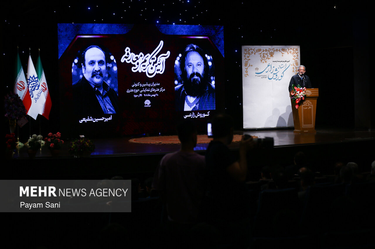 آئین تکریم کوروش زارعی و معارفه امیرحسین شفیعی، مدیران پیشین و کنونی مرکز هنرهای نمایشی حوزه هنری، امروز سه شنبه ۲۸ بهمن، در تالار سوره حوزه هنری برگزار شد.