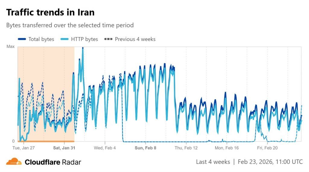 بر اساس رادار کلادفلر، پس از ۲۱ بهمن ۱۴۰۴، ترافیک اینترنت کشور به شکل قابل توجهی سقوط کرد و به میزان حدود نصف روزهای قبل رسید. پس از پایان قطع اینترنت در ۶ بهمنماه، وضعیت همچنان بدتر از گذشته بود اما آنطور که کلادفلر میگوید، اختلالها با همان شدت ادامه پیدا نکرد و بیشتر از قبل شد.