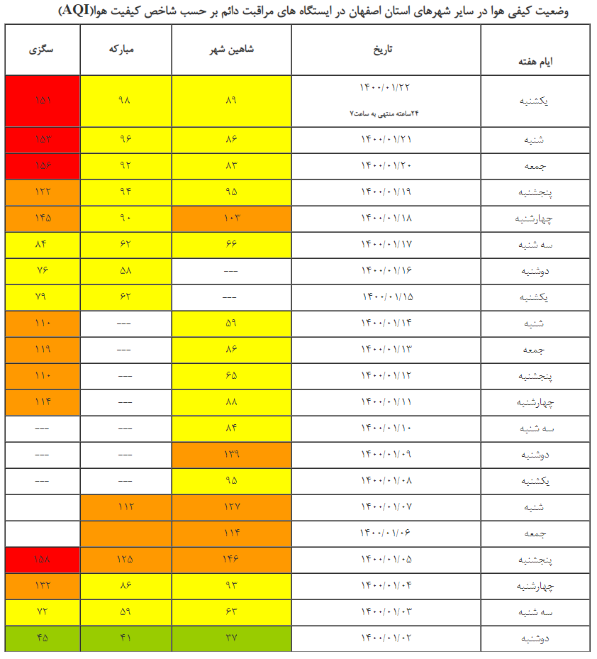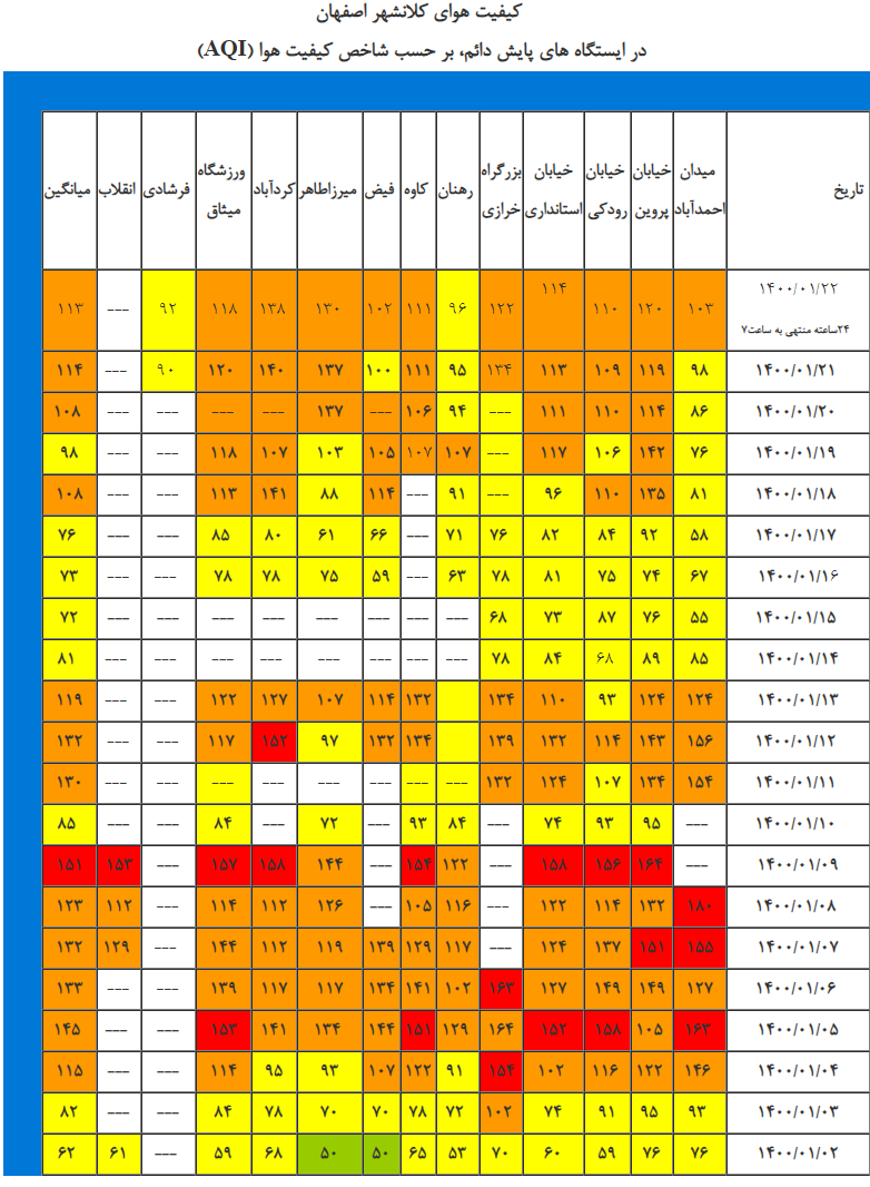 براساس اعلام این مرکز میانگین شاخص کیفیت هوا با ثبت عدد ۱۱۳ بر مدار نارنجی و وضعیت در ایستگاههای سنجش کیفیت هوا در کلانشهر اصفهان به شرح ذیل است.