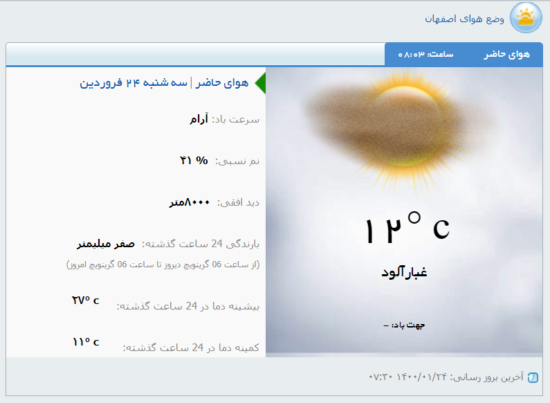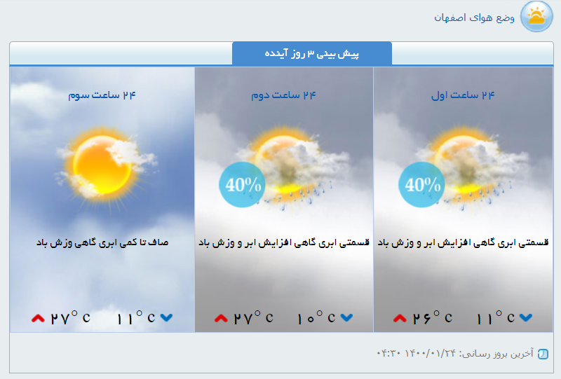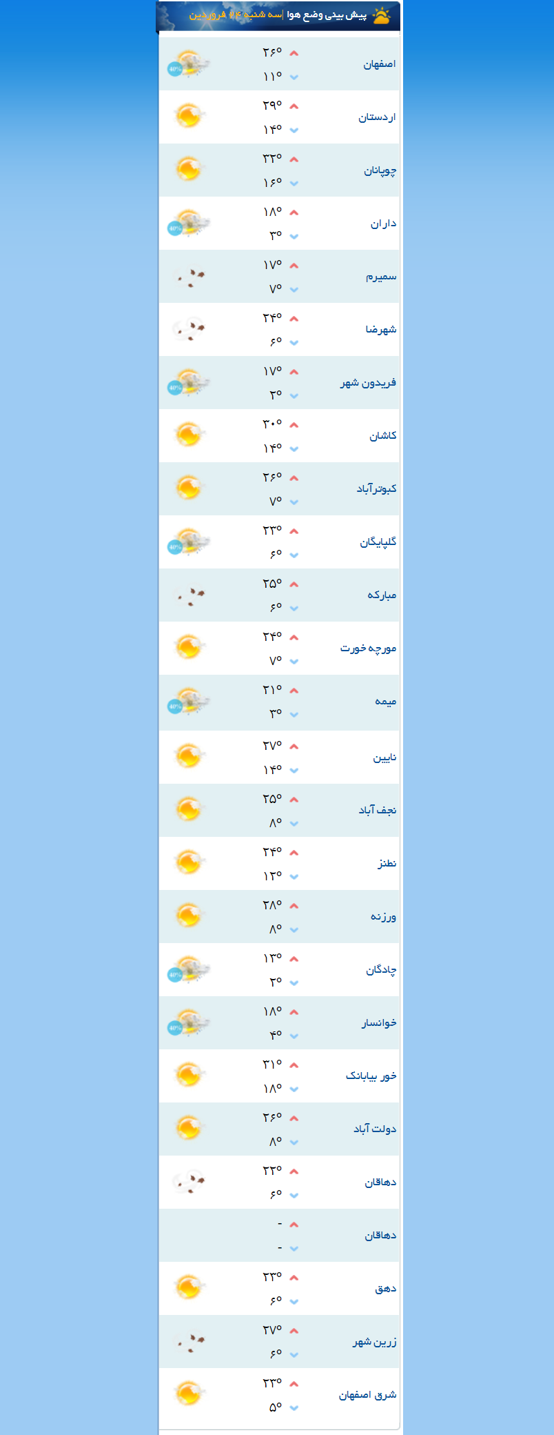 بر اساس این گزارش دمای هوا در ۲۴ ساعت آینده در بیشتر مناطق استان یک تا ۲ درجه کاهش خواهد داشت و هوای کلانشهر اصفهان امروز سهشنبه، قسمتی ابری گاهی افزایش ابر و وزش باد به نسبت شدید با احتمال رگبار پراکنده و برای چهارشنبه، قسمتی ابری گاهی افزایش ابر و وزش باد به نسبت شدید و احتمال رگبار پراکنده پیش بینی میشود.