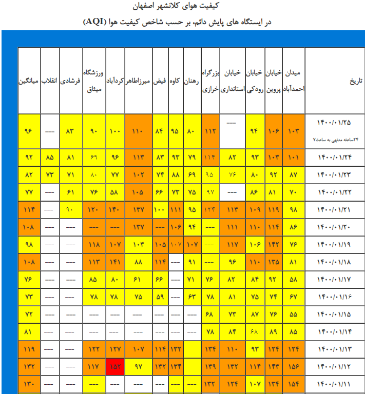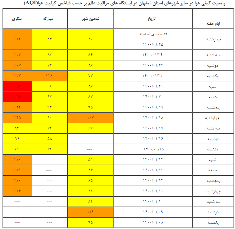 بر اساس این گزارش میانگین شاخص کیفیت هوا در شهر اصفهان با ثبت عدد ۹۶ بر مدار زرد است و به این ترتیب اصفهان برای چهارمین روز پیاپی، هوایی سالم دارد.