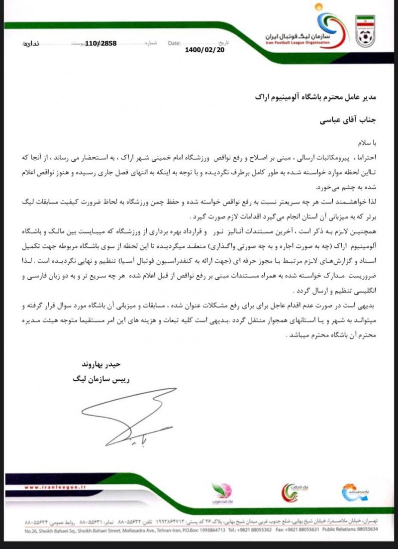 سازمان لیگ برتر فوتبال با ارسال نامه‌ای به باشگاه آلومینیوم اراک، آن‌ها را به سلب میزبانی در مسابقات لیگ برتر تهدید کرد.