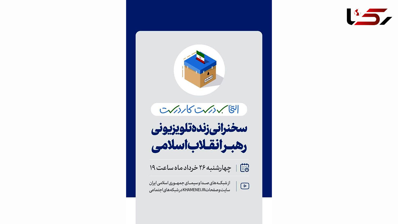 به گزارش رکنا، در آستانه برگزاری انتخابات1400 حضرت آیت الله خامنهای چهارشنبه ۲۶ خرداد ۱۴۰۰ به صورت تلویزیونی با مردم سخن خواهند گفت.