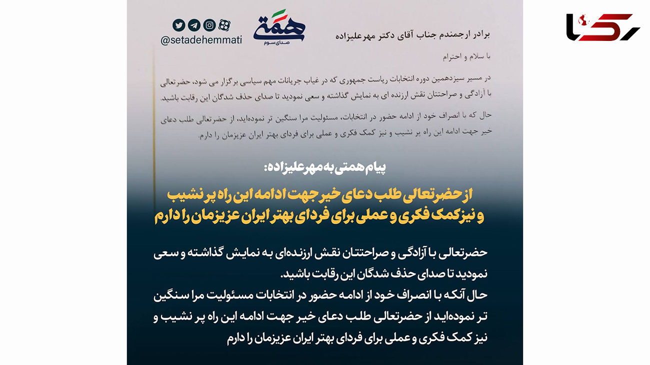 به گزارش رکنا، عبدالناصر همتی در نامه‌ای خطاب به محسن مهرعلیزاده  در خصوص انصراف از انتخابات1400 نوشت: