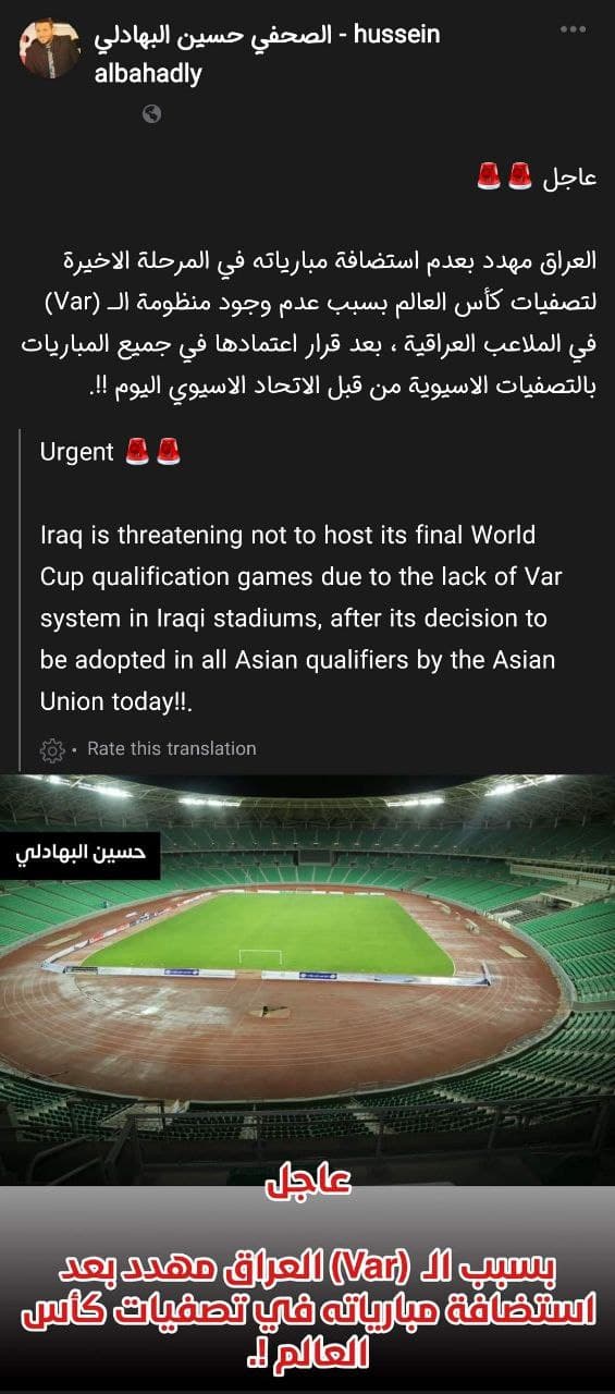 در پی انتشار این خبر، حسین البهادلی خبرنگار عراقی از احتمال سلب میزبانی از این کشور در صورت برگزاری بازی ها به صورت رفت و برگشت، خبر داد. این خبرنگار در صفحه فیس بوک خود نوشت: پس از تصمیم برای تصویب VAR در تمام مسابقات مقدماتی جام جهانی توسط فدراسیون فوتبال آسیا، عراق به دلیل فقدان وجود سیستم کمک داور ویدیویی در استادیوم هایش، به از دست دادن میزبانی بازی های خانگی تهدید می شود.