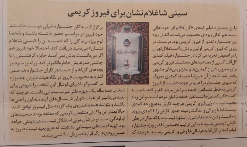 جالب است بدانید که علیرضا خمسه در این جشنواره به عنوان مجری از فیروز کریمی تعریف کرده و جایزه او که یک سینی منقش به نقش شاغلام کاراکتر اصلی طنز نشریه گل آقا بوده، به وی اهدا کرده است.