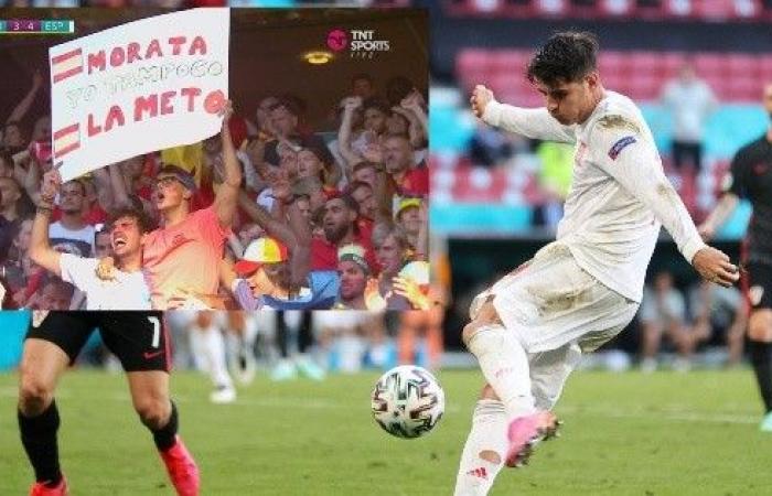 دقایقی قبل از گلزنی موراتا، دوربین ها روی دو هوادار اسپانیا زوم کردند. این دو پلاکاردی عجیب در دست داشتند که مضمونش کنایه به گل نزدن های موراتا بود:« موراتا من هم نمی توانم گل بزنم.»