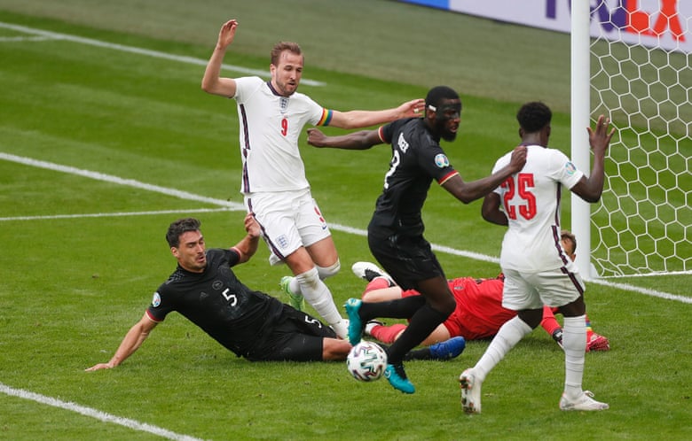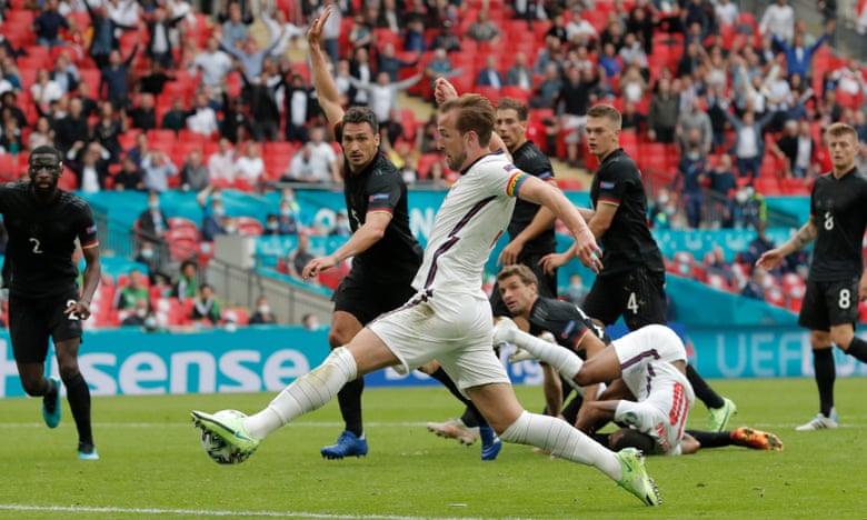 اما در ثانیه های پایانی نیمه اول و روی اشتباه توماس مولر، این رحیم استرلینگ بود که به سمت دروازه آلمان حرکت کرد و دستپاچگی مدافع این تیم در دفع توپ باعث شد توپ به صورت اتفاقی در مقابل هری کین قرار بگیرد.