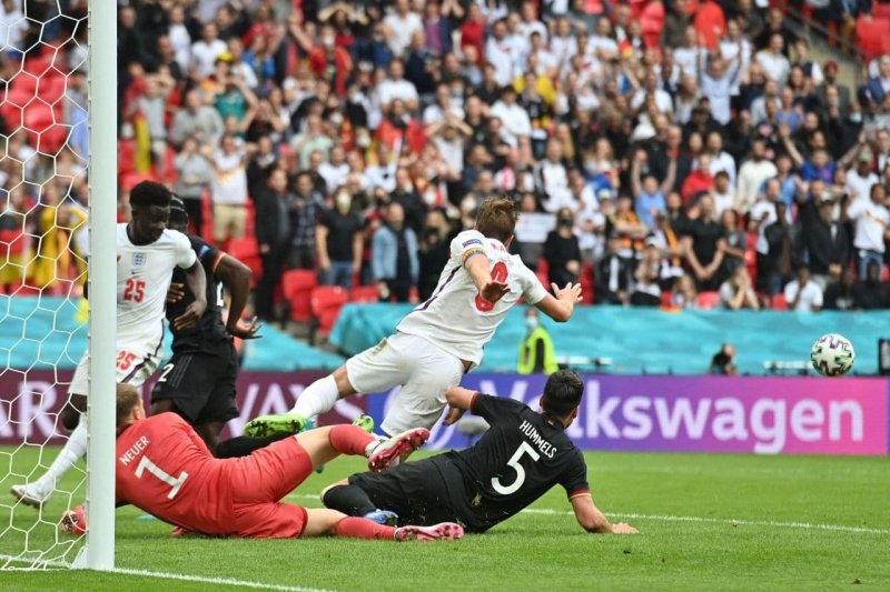 نیمه اول دیدار دو تیم آلمان و انگلیس در شرایطی با تساوی بدون گل به اتمام رسید که هری کین در یکی دو صحنه فرصت های خوبی برای گلزنی داشت. ابتدا روی ارسال یک ضربه ایستگاهی او می توانست دروازه مانوئل نویر را باز کند، اما مت هوملس با جایگیری دقیق خود و ضربه سر این خطر را دفع کرد.