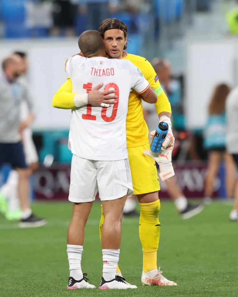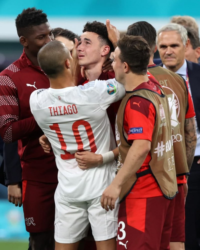 تیاگو علاوه بر دلداری دادن به بازیکن جوان سوئیسی ها که با چشمانی اشکبار حسرت پنالتی هدر رفته خود را می خورد، به سمت زومر، دروازه بان تیم حریف هم رفته و او را در آغوش گرفت و دقایقی به صحبت با ستاره سوئیسی ها در این دیدار پرداخت.