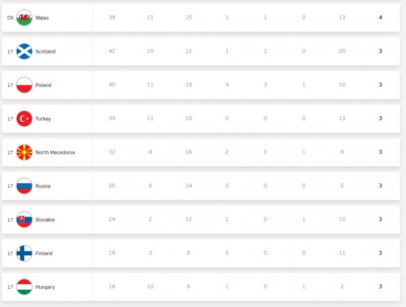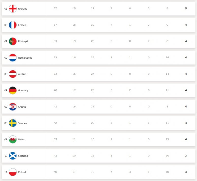 شگفتی این دوره، دانمارک پس از پیروزی بر چک به چهار تیم برتر رسید. آمار این تیم نشان می‌دهد حضور آن‌ها اتفاقی نیست و وایکینگ‌ها، سومین تیم برتر از لحاظ آمار حمله هستند. 90 تلاش برای گلزنی و 37 شوت در چارچوب در پنج مسابقه نشان می‌دهد انگلیس کار سختی خواهد داشت.