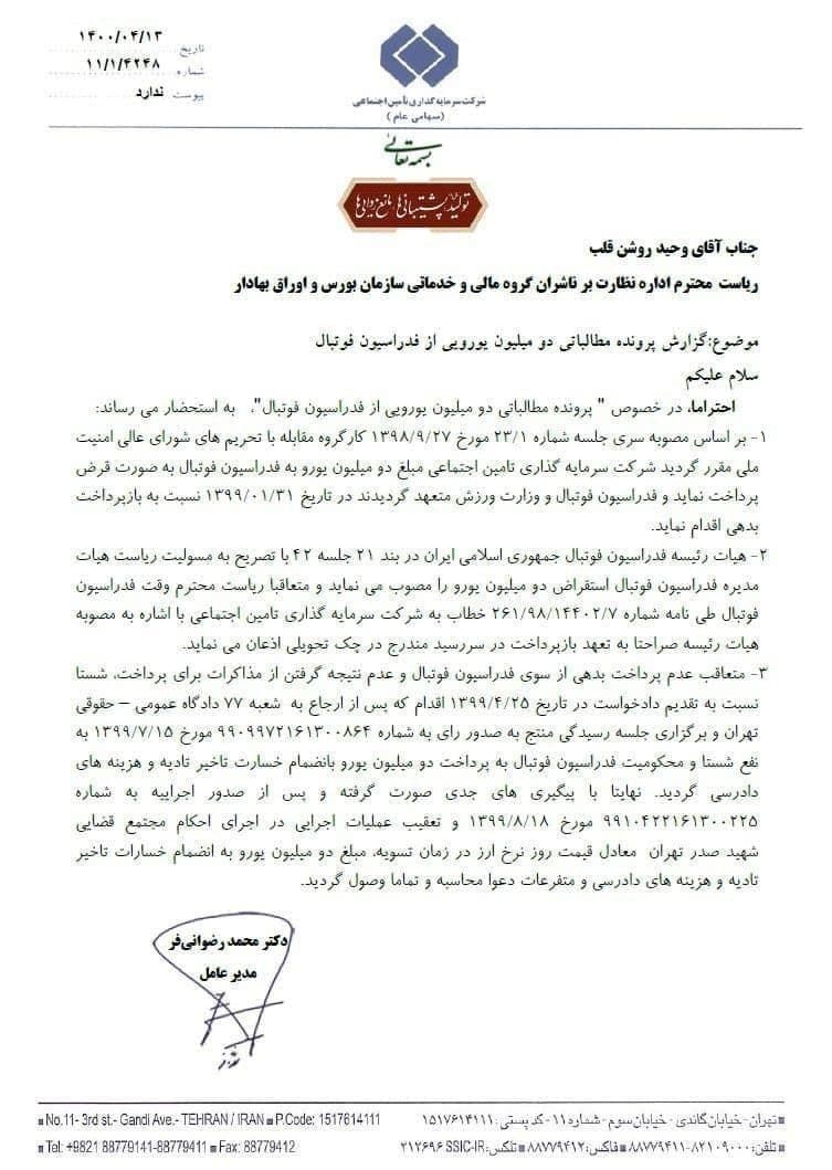طلب دو میلیون یورویی تسویه شد؛ / نامه مبهم شستا درخصوص بدهی فدراسیون (عکس)