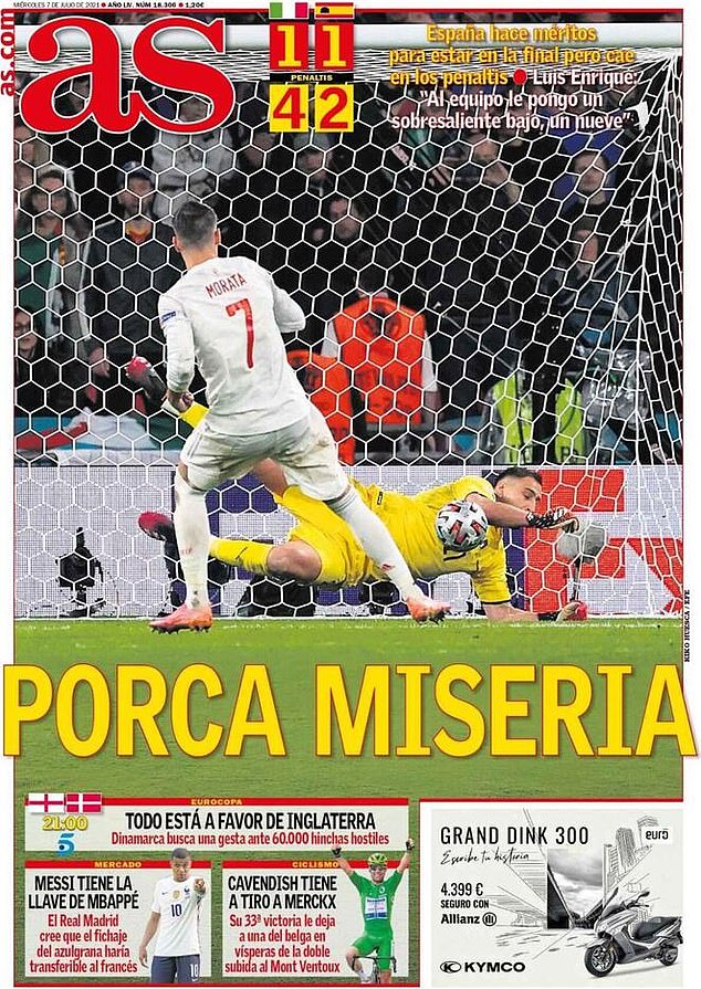 در اسپانیا اما بر خلاف جشن و سرور ایتالیایی ها، صفحه نخست روزنامه ها حال و هوایی غمگین و عزادار دارد. آاس از یک جمله معروف ایتالیایی در صفحه نخست خود استفاده کرده و درست در کنار عکسی از موراتا در حال زدن ضربه پنالتی که دوناروما مهار می کند، تیتر زده "گندش بزنن".