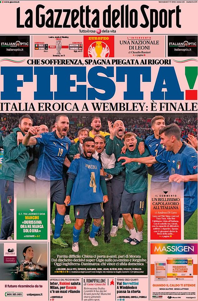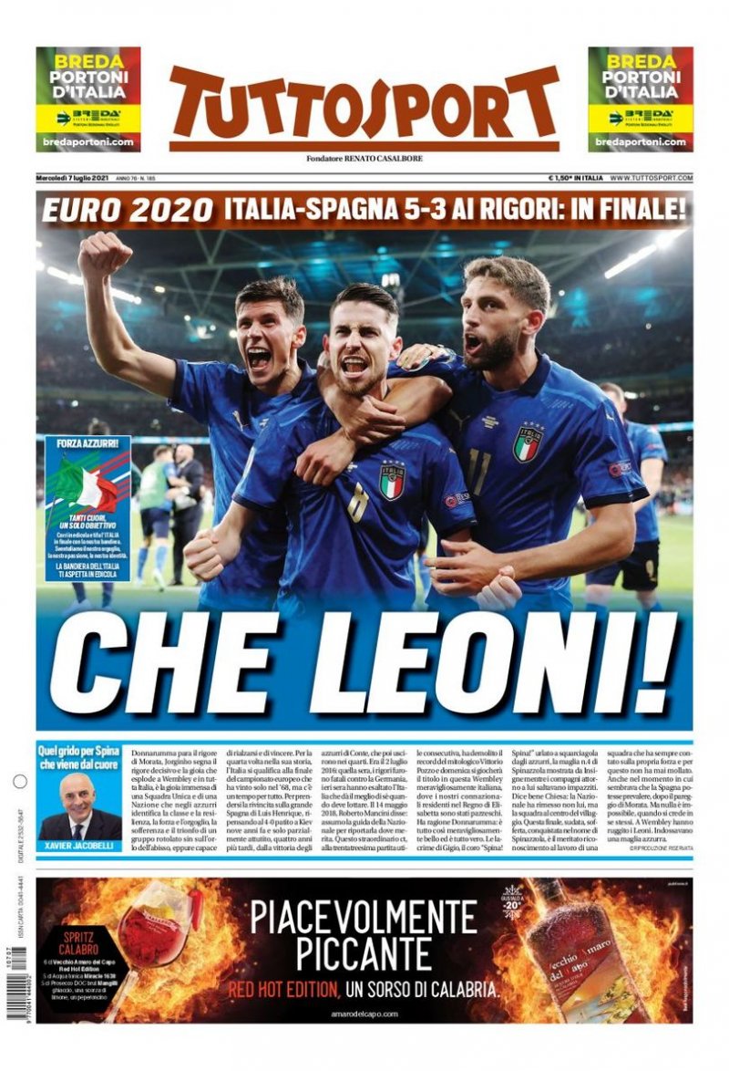 کوریره دلو اسپورت عکس صفحه نخست خود را به شادی بازیکنان ایتالیایی پس از پنالتی جورجینو اختصاص داده و در حالی که رسیدن آتزوری به فینال را با شادی زایدالوصف و غیرقابل کنترلی جشن گرفته اند، تیتر زده: "خدا ایتالیایی است".