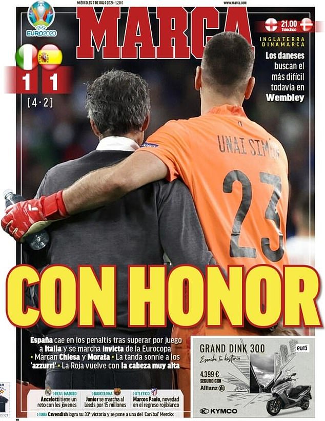 مارکا مسیری متفاوت نسبت به دو روزنامه دیگر اسپانیایی در پیش گرفته و صفحه نخست خود را به عکسی از لوییز انریکه و اونای سیمون، سرمربی و دروازه بان اسپانیا، اختصاص داده است که پس از پایان مسابقه دست در گردن یکدیگر دارند. مارکا تیتر زده: "با افتخار".