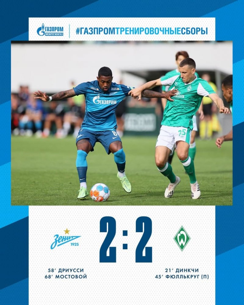 به گزارش "ورزش سه"، تیم فوتبال زنیت سن پترزبورگ که در اردوی آماده سازی خود در اتریش به سر می برد، در دومین بازی خود به مصاف وردربرمن رفت و در حالیکه با 2 گل از حریف آلمانی خود عقب بود، به بازی برگشت و این دیدار با تساوی 2 – 2 به پایان رسید.