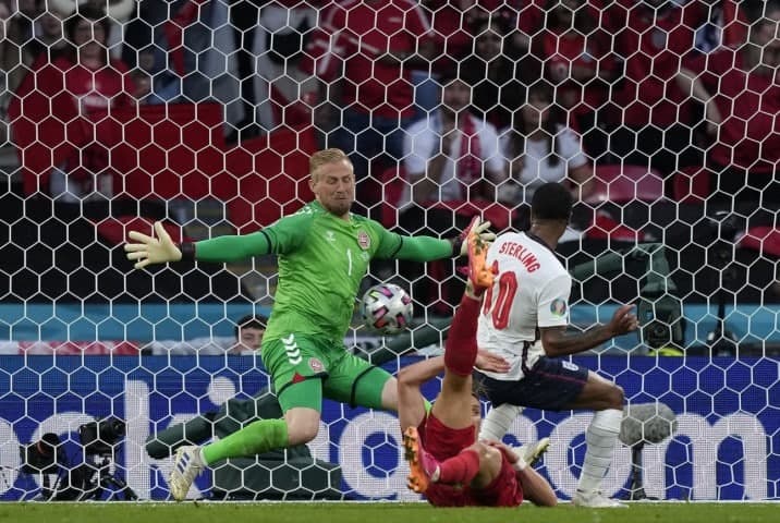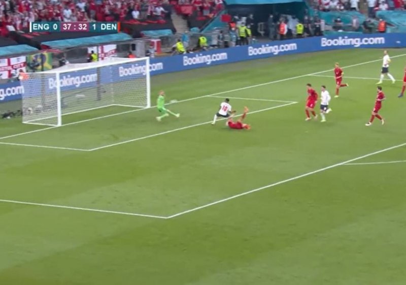 این موقعیت را رحیم استرلینگ در دقیقه 38 به دست آورد و با کم دقتی آن را از دست داد؛ او در دهانه دروازه در حالی که فقط اشمایکل را مقابل خود می دید، توپ را به سینه دروازه بان دانمارک کوبید تا فرصت گلزنی در نیمه اول این دیدار را به راحتی از دست بدهد. رحیم اما خوش شانس بود که چند دقیقه بعد از این صحنه، انگلیس به گل رسید تا بازنده راهی رختکن نشود.