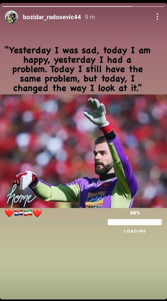 از این صحبت های سرمربی پرسپولیس ساعاتی بیشتر نگذاشته که حالا رادوشوویچ برخلاف روزهای گذشته که رفتار او نشانی از بازگشت نداشت، با انتشار یک استوری به احتمال بازگشتش قوت بخشیده است. او در استوری ای که منتشر کرده، اینطور نوشته است:« روز گذشته من غمگین بودم، امروز من خوشحالم، من روز گذشته مشکل داشتم. امروز هم هنوز همان مشکل را دارم؛ اما امروز من شیوهای که به آن نگاه میکنم را تغییر دادم.»