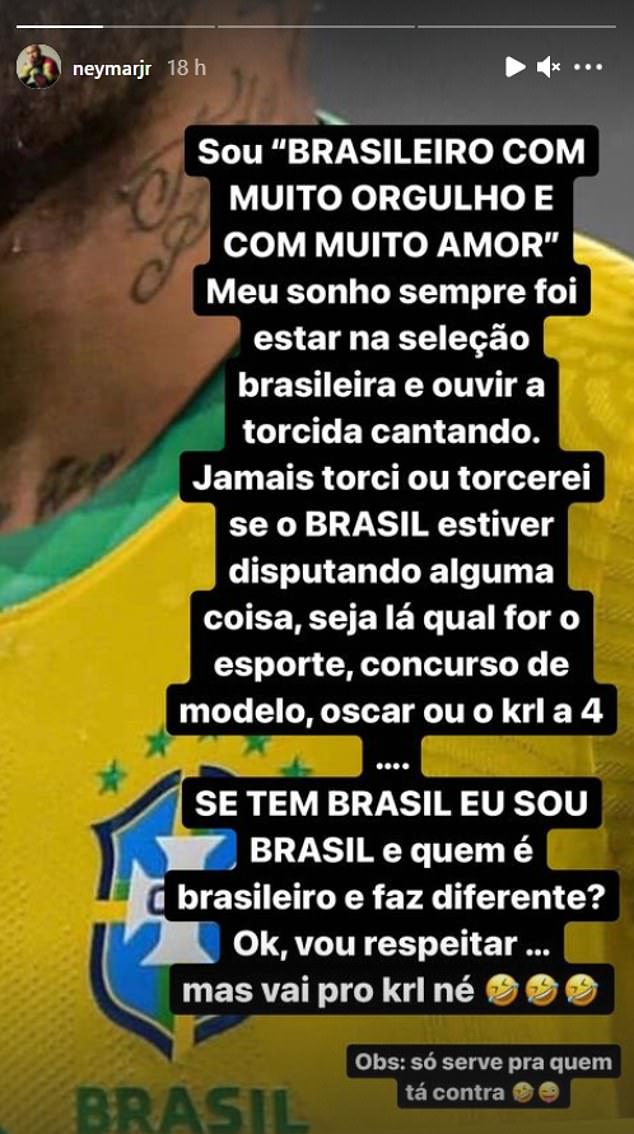 اما نظرات برخی هواداران فوتبال برزیل در حمایت از لیونل مسی به مذاق نیمار خوش نیامده و او اینگونه عکس العمل نشان داده است. نیمار در اینستاگرام خود نوشت: "من با غرور و عشق فراوان برزیلی هستم. رویای من همیشه حضور در تیم ملی برزیل و شنیدن شعارهای هواداران بوده است.
