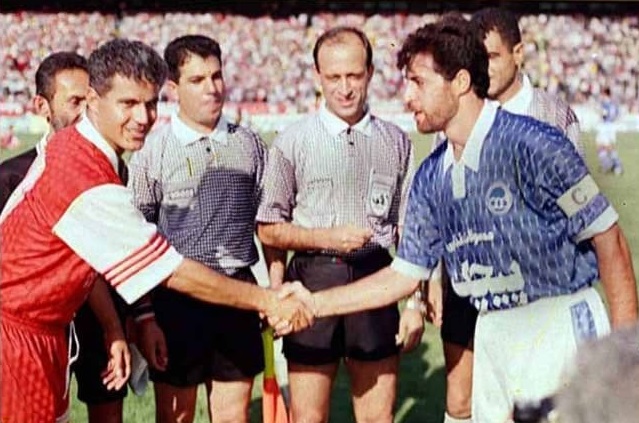 فرشاد پیوس در مراسم ابتدای بازی در کنار صادق ورمرزیار و در مقابل جمال شریف که بدترین خاطره عمر دوران ورزشی فرشاد را برایش رقم زد.