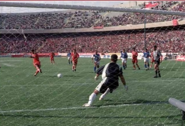 ژست های خاص مدافع محبوب پرسپولیس؛ هاشمی نسب که آن روزها شش می پوشید بعد از گل افشین در مقابل دوربین ها خودنمایی می کند.