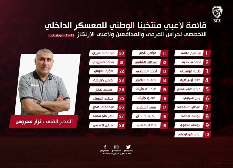 فدراسیون فوتبال سوریه در بیانیه خود تأیید کرد که اردو از فردا دوشنبه آغاز می شود و این تمرینات فقط با حضور دروازه بان ها، بازیکنان خط دفاعی و بازیکنان میانه میدان برگزار می شود که تمامی افراد دعوت شده، از لیگ داخلی این کشور هستند.